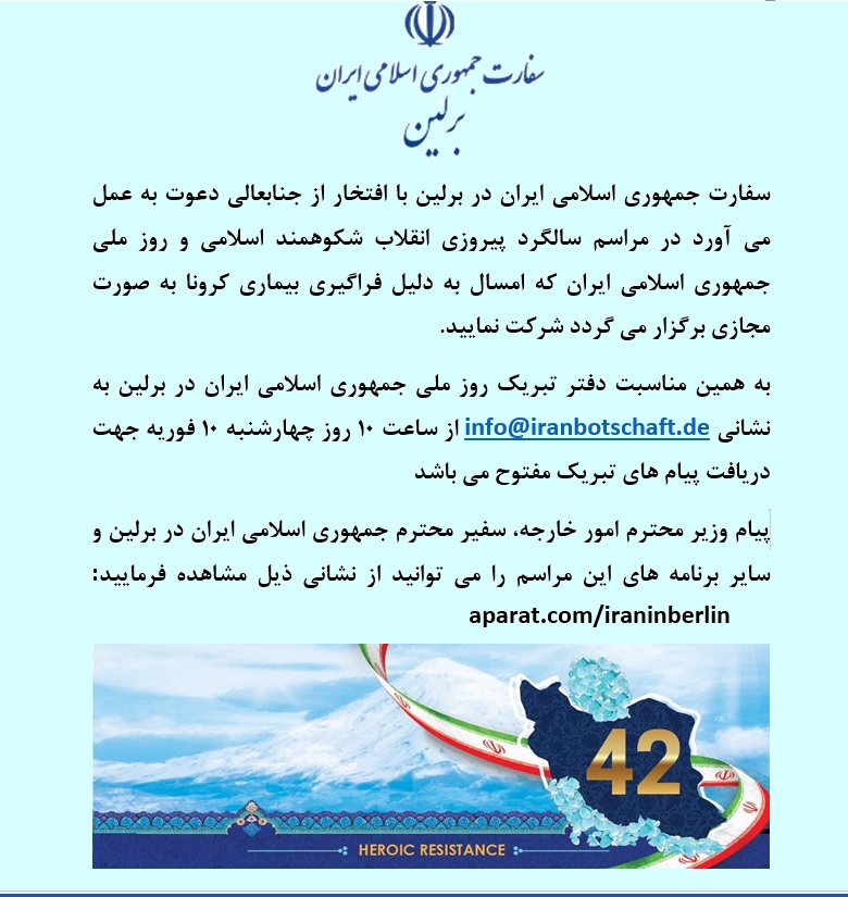 سفارت جمهوری اسلامی ایران در برلین با افتخار دعوت به عمل می آورد در مراسم سالگرد پیروزی انقلاب شکوهمند اسلامی و روز ملی جمهوری اسلامی ایران که امسال به دلیل فراگیری بیماری کرونا به صورت مجازی برگزار میشود، شرکت نمایید