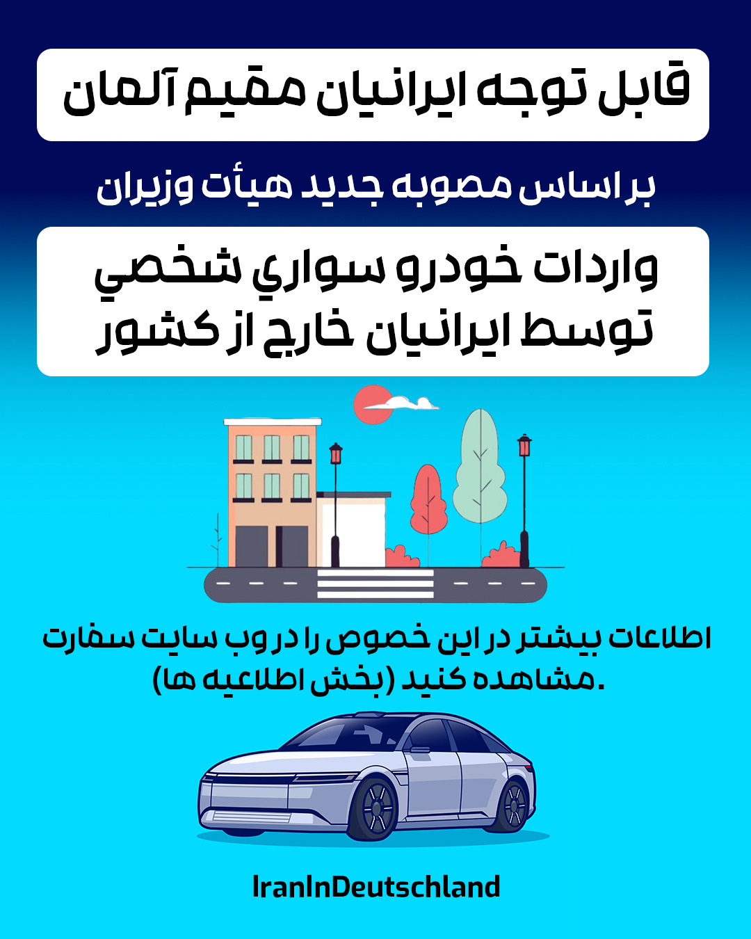 به آگاهی هموطنان گرامی مقیم خارج از کشور، به‌ویژه ایرانیان مقیم جمهوری فدرال آلمان می‌رساند؛ بر اساس مصوبه هیأت محترم وزیران و ابلاغ وزارت صنعت، معدن و تجارت، امکان ثبت درخواست واردات خودروی شخصی برای ایرانیان خارج از کشور فراهم شده است.